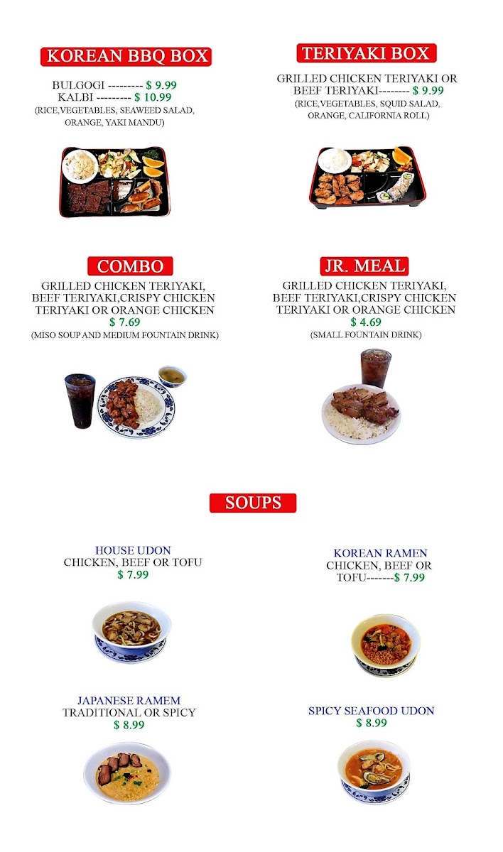 Grilled chicken teriyaki, beef teriyaki, crispy chicken teriyaki, or orange chicken. Small fountain drink. Miso soup and medium fountain drink.