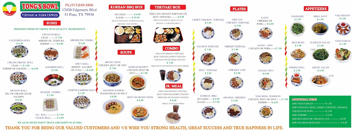 If you're craving a delicious, satisfying meal with a mix of bold flavors, look no further than Yong's Bowl Teriyaki & Sushi Menu. Located at 12430 Edgemere Blvd #210, El Paso, TX, this spot serves up a mouthwatering selection of fresh sushi and savory teriyaki dishes. Whether you're in the mood for something light like sushi rolls, or something hearty like a sizzling bowl of teriyaki, each dish is crafted with care and attention to detail.